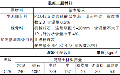 混凝土強度等級C25,采用商品料,罐車直接進車間車體側(cè)面傾卸攤鋪,坍落度為130±10mm,水泥占膠凝材料比例為77%,砂率為42%,水灰比0.51,初凝時間4~5h;終凝時間為8~10h。