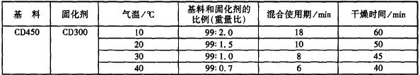 (一)預混:按比例將固化劑CD300加入基料CD450中.立即用電動攪拌機低速攪拌均勻,混合比率、混合使用期及干燥時間隨溫度變化,溫度低時適量增加固化劑,溫度高時適量減少固化劑,參考數(shù)據(jù)如下表: