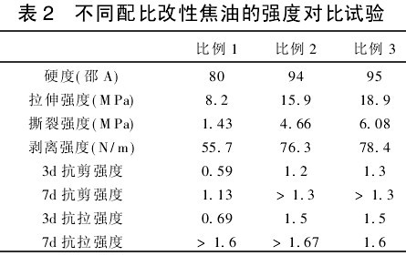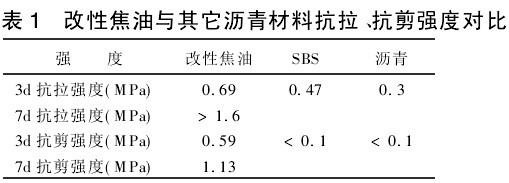 (1)改性焦油(比例1)與其它瀝青材料抗拉、抗剪強(qiáng)度對比,結(jié)果見表1。