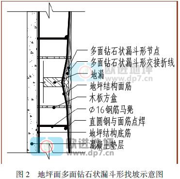3.3.4 為確保多面鉆石狀漏斗成型,地坪結(jié)構(gòu)面筋節(jié)點(diǎn)下布設(shè)一根ф16 圓鋼直馬凳,按該節(jié)點(diǎn)標(biāo)高下35mm 為面筋頂面,確保保護(hù)層的統(tǒng)一。