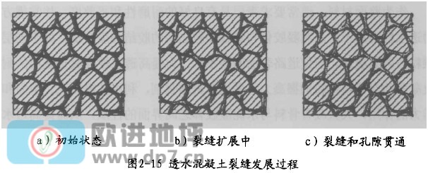 首先在應(yīng)力較小的情況下,由于水泥石的固結(jié)作用,混凝土體基本上保持初始狀態(tài),粘結(jié)面上的微裂縫總體沒(méi)有發(fā)生改變;隨著應(yīng)力的增加,過(guò)渡區(qū)的微裂縫開(kāi)始產(chǎn)生,隨著荷載的增加,裂縫的長(zhǎng)度和寬度加大,但這還沒(méi)有導(dǎo)致相互緊挨著的骨料間的粘結(jié)面的完全脫開(kāi),伴隨著這一過(guò)程,由于微裂縫的發(fā)展,骨料間存在著細(xì)微的位置調(diào)整,這期間會(huì)出現(xiàn)若干平臺(tái)區(qū),即應(yīng)變?cè)黾樱鴳?yīng)力不增加,甚至?xí)霈F(xiàn)應(yīng)力減小的情況,這種情況出現(xiàn)的原因是透水混凝土中存在大量的孔隙,當(dāng)壓力超過(guò)一定界限時(shí),混凝土體內(nèi)存在著明顯的應(yīng)力重分布的情況:最后當(dāng)應(yīng)力進(jìn)一步加大,裂縫的進(jìn)一步擴(kuò)展,直至骨料間的水泥石粘結(jié)面完全斷開(kāi),裂縫和混凝土體中的孔隙貫通,導(dǎo)致混凝土的最終破壞,破壞過(guò)程如圖2所示。