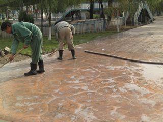 | 藝術(shù)地坪施工1. 鋪筑砼前按圖規(guī)定和標(biāo)高支模.人行道基層砼為50mm以上,行車道基層砼為80mm以上; |