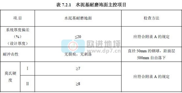 水泥基耐磨地面主控項(xiàng)目的驗(yàn)收應(yīng)符合表 7.2.1 的規(guī)定。