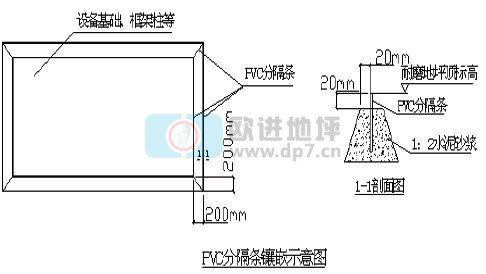 (4) 標高測設(shè)及鑲嵌分隔條。用水準儀將+50cm標高所有框架柱及墻面上,并據(jù)此貼出灰餅,灰餅間距不大于3m,灰餅材料建議選用細石混凝土。根據(jù)測設(shè)的標高在所有設(shè)備基礎(chǔ)、混凝土柱、溝道、坑池、洞口、管道與耐磨地坪交接處鑲嵌PVC分隔條。分隔條鑲嵌必須牢固、平直、順滑,上標高準確。鑲嵌完成后必須用施工線或者水準儀符合校驗,本道工序是控制好耐磨地坪平整度的前提,標高必須由專業(yè)技術(shù)人員進行測量。分隔條鑲嵌如下圖所示: