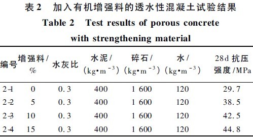 試驗(yàn)表明,隨著增強(qiáng)料摻量的增加,透水性混凝土強(qiáng)度也增加。但考慮增強(qiáng)料的成本影響,應(yīng)根據(jù)設(shè)計(jì)強(qiáng)度要求確定摻量。